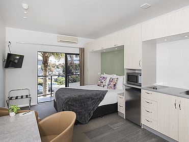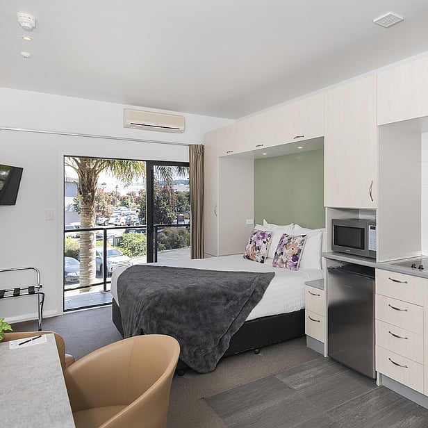 Perfect for both business and leisure travelers. Located on the carpark/city side of the building, these studios enjoy ample afternoon sun with views over the carpark.